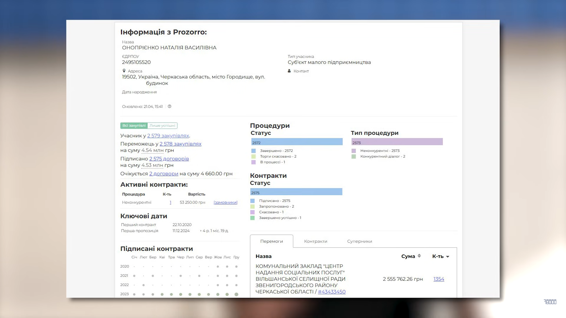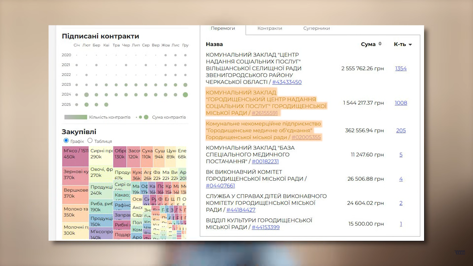 Наприклад, бізнес‐вумен Наталія Онопрієнко з Городища за останні роки підписала понад тисячу прямих договорів із Центром надання соціальних послуг Вільшанської селищної ради. Його директорка – Ольга Гава.