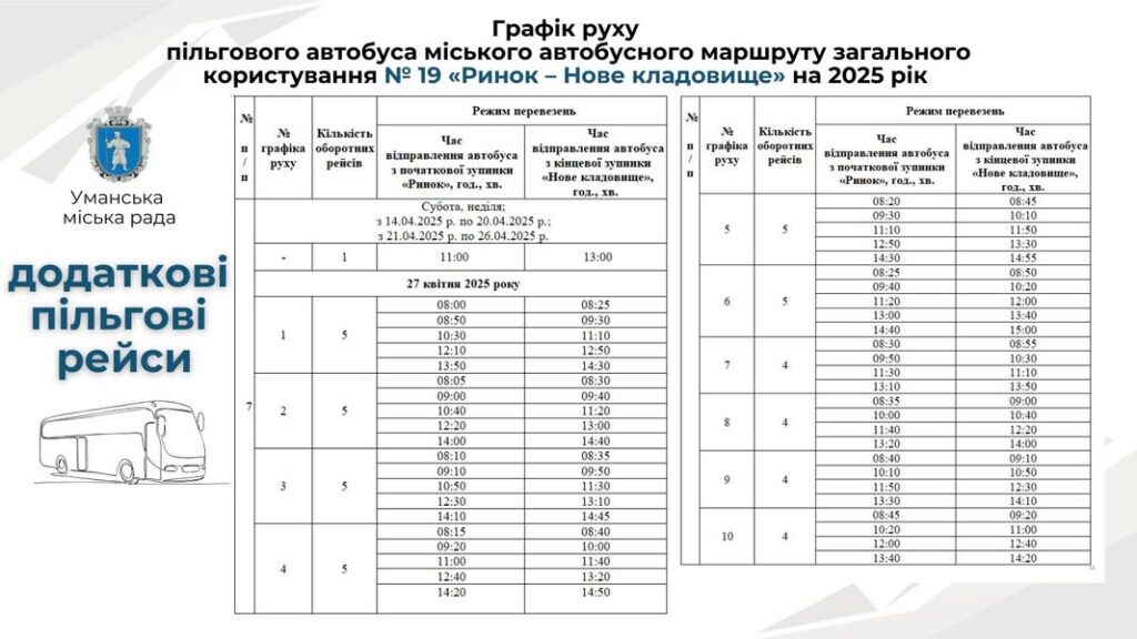 В Умані введуть додаткові пільгові рейси для автобусного маршруту № 19 «Ринок – Нове кладовище». Таке рішення ухвалили на засіданні виконавчого комітету.
