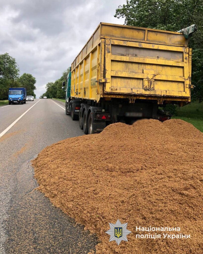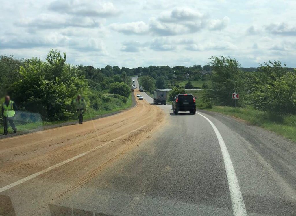 59‐річний водій вантажного автомобіля «DAF» не переконався у надійності кріплення вантажу перед виїздом. Близько 15:00 години борти причепа відкрилися, а вантаж висипався на дорогу. Так було забруднено до кілометра дороги.
