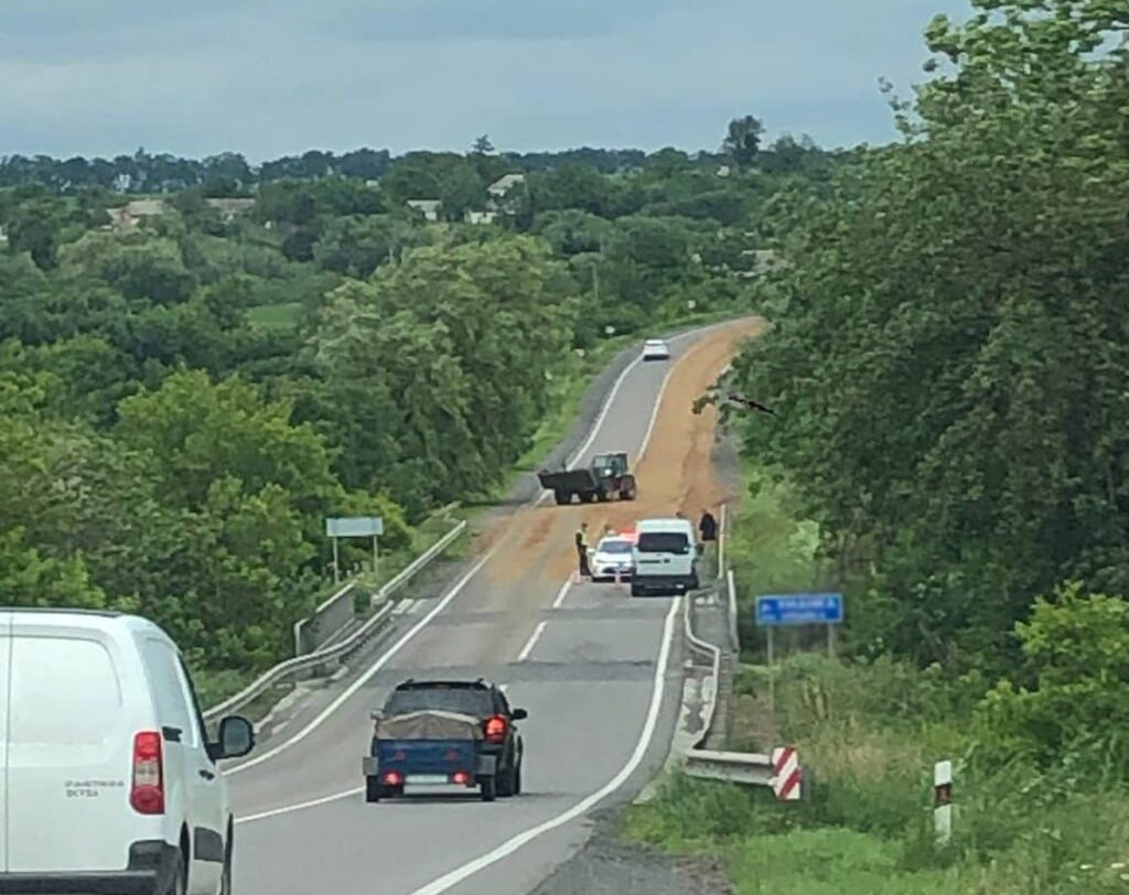Водій вантажівки «DAF» допустив висип вантажу на проїжджу частину траси «Умань‐Золотоноша». Інцидент стався 13 червня поблизу села Гереженівка на Уманщині.