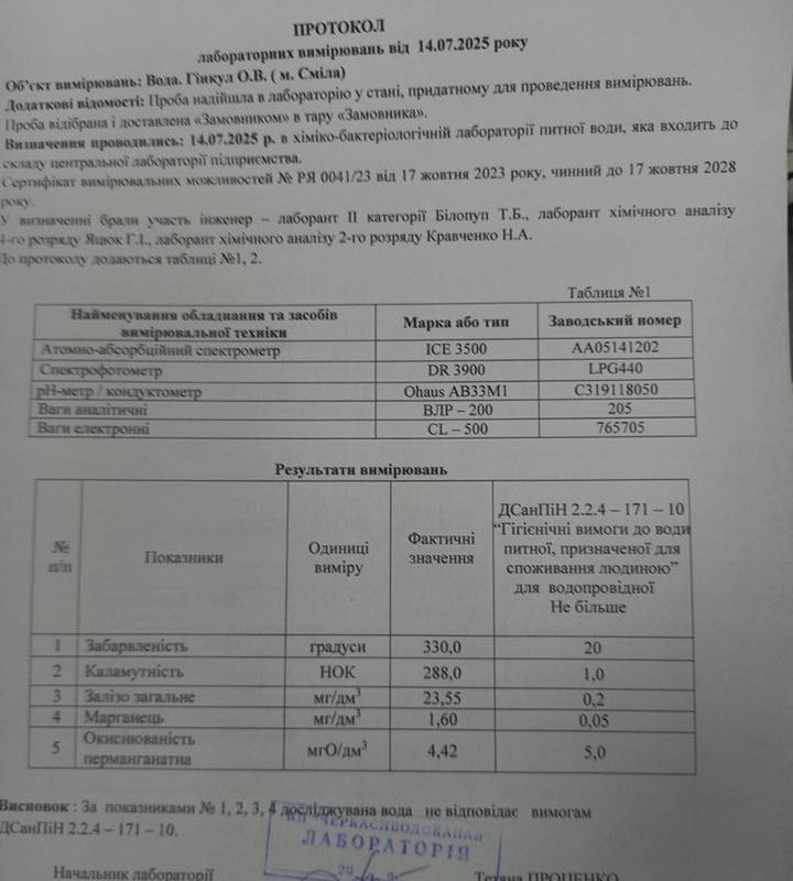 За результатом лабораторного дослідження, каламутність води в 288 разів перевищувала норму. Серед інших показників: