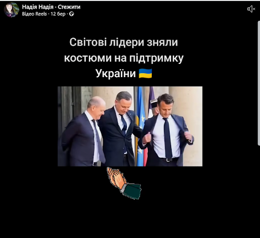 Згодом у мережі «Facebook», серед черкаських груп почало з’являтися згенероване штучним інтелектом відео, де нібито світові лідери зняли костюми в підтримку України. У цих матеріалах фігурують Еммануель Макрон, Анджей Дуда, Олаф Шольц та інші.