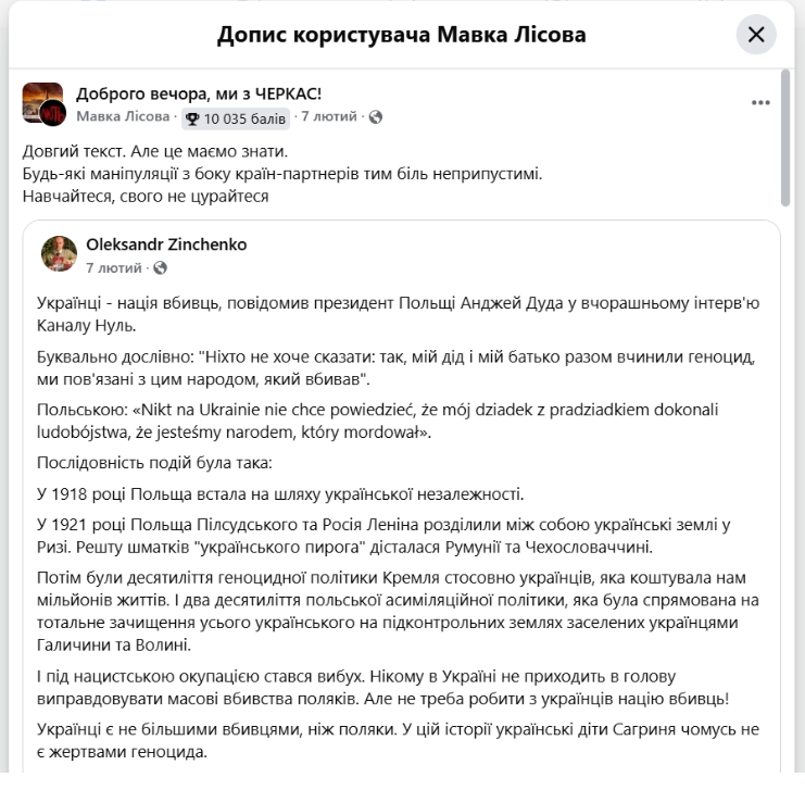 На Facebook‐сторінці «Доброго вечора, ми з Черкас» поширили публікацію з маніпулятивним та гучним заголовком – «Українці – нація вбивць, повідомив президент Польщі Анджей Дуда у вчорашньому інтерв’ю Каналу Нуль».