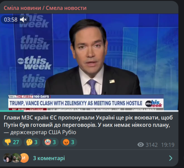Залишаємось у Telegram‐каналі «Сміла новини». Серед поширених публікацій та промов, була заява держсекретаря США Рубіо про те, що глави МЗС країн‐членів ЄС пропонували Україні «ще рік повоювати, щоб путін був готовий до перемовин». Нібито «у ЄС немає жодного плану».