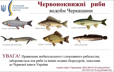Заборона діє на вилов червонокнижної риби. Найпоширеніші види, які можуть траплятися у водоймах Черкащини: