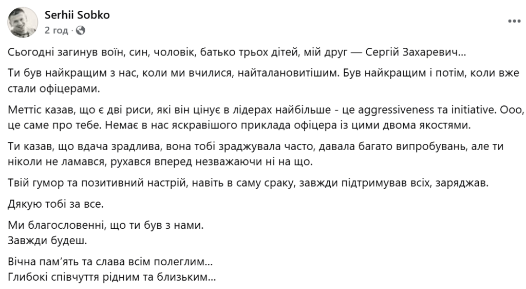 «Сьогодні загинув воїн, син, чоловік, батько трьох дітей, мій друг — Сергій Захаревич… Ти був найкращим з нас, коли ми вчилися, найталановитішим. Був найкращим і потім, коли вже стали офіцерами.