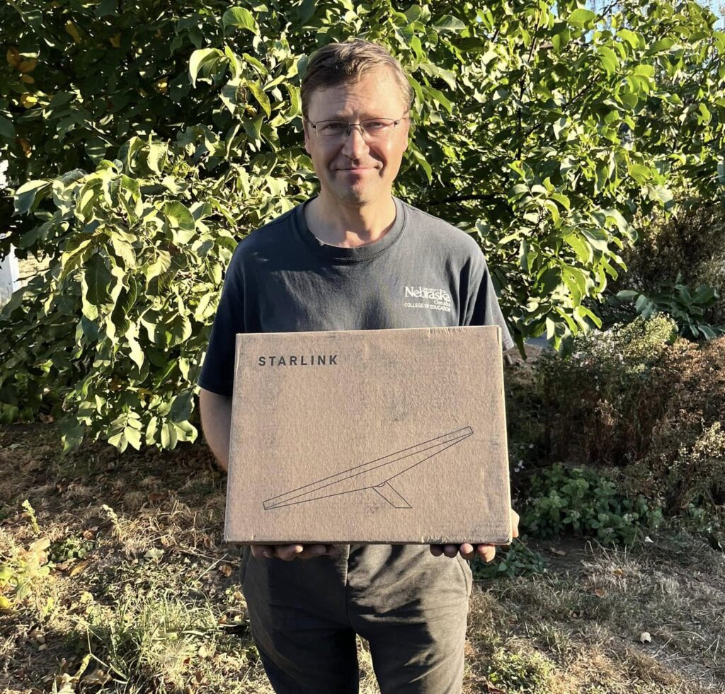 Григорій Заспа зі старлінком у коробці. Фото: з фейсбук‐сторінки Григорія Заспи
