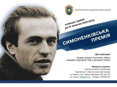 Розпочався прийом творчих робіт на здобуття Всеукраїнської літературної премії імені Василя Симоненка. Він триватиме до 1 жовтня. Про це повідомили у пресслужбі Черкаської ...