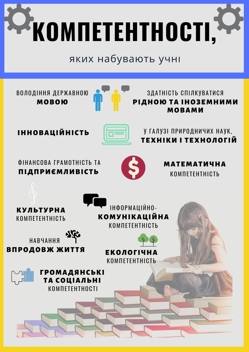 З першого класу діти будуть не запам’ятовувати факти та визначення понять, а набиратимуть компетентностей. Їхній перелік затверджений у Законі України «Про освіту». Усього там визначено 11 основних компетентностей. Та це не вичерпний перелік і він може розширюватися.