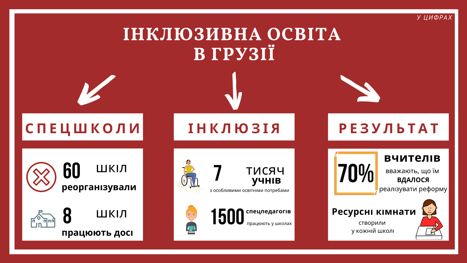 «У них виникало чимало аргументів, чому впровадження інклюзії у школах – це поганий проєкт. Стверджували, що це не допоможе, будуть проблеми, не існує навчальних матеріалів тощо. Практика ж показала, що цей досвід став позитивним. За нашими підрахунками, 70% учителів вважають, що їм вдалося реалізувати цю реформу», – говорить Тамуна Ісакадзе.