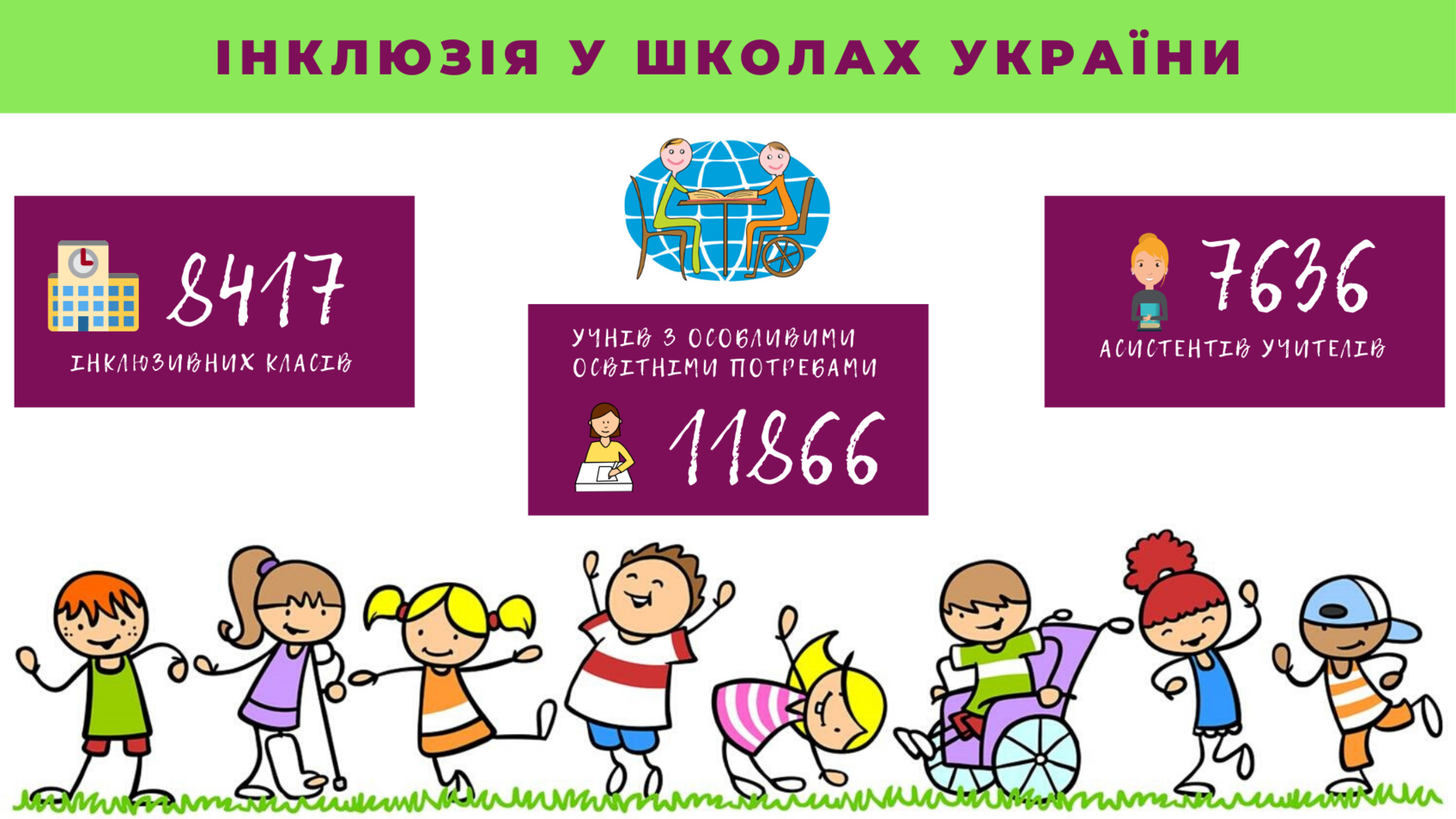 У минулому навчальному році в Україні функціонували 8 417 інклюзивних класів в 3 790 закладах середньої освіти. У них навчалися 11 866 учнів, з якими працювали 7 636 асистентів учителів. Протягом останніх 3 років кількість інклюзивних класів в Україні зросла в 3,1 рази, кількість шкіл, що мають інклюзивні класи, – в 2,5 рази, а кількість дітей, які здобувають у них освіту – в 2,8 рази, інформує Міністерство освіти.