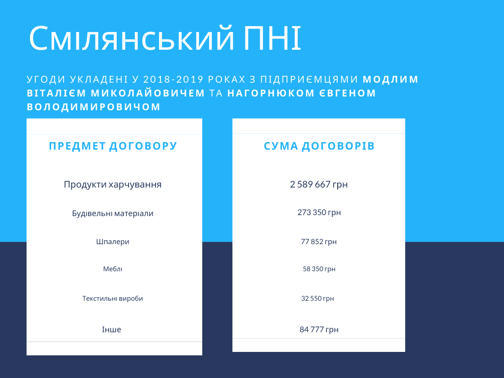 На двох підприємці протягом 2018–2019 року підписали із закладом 173 угоди, загальною вартістю 3,1 млн гривень. Переважно предметом договору були продукти харчування, проте постачають підприємці закладу і інші речі – будівельні матеріали, меблі, текстильні вироби.